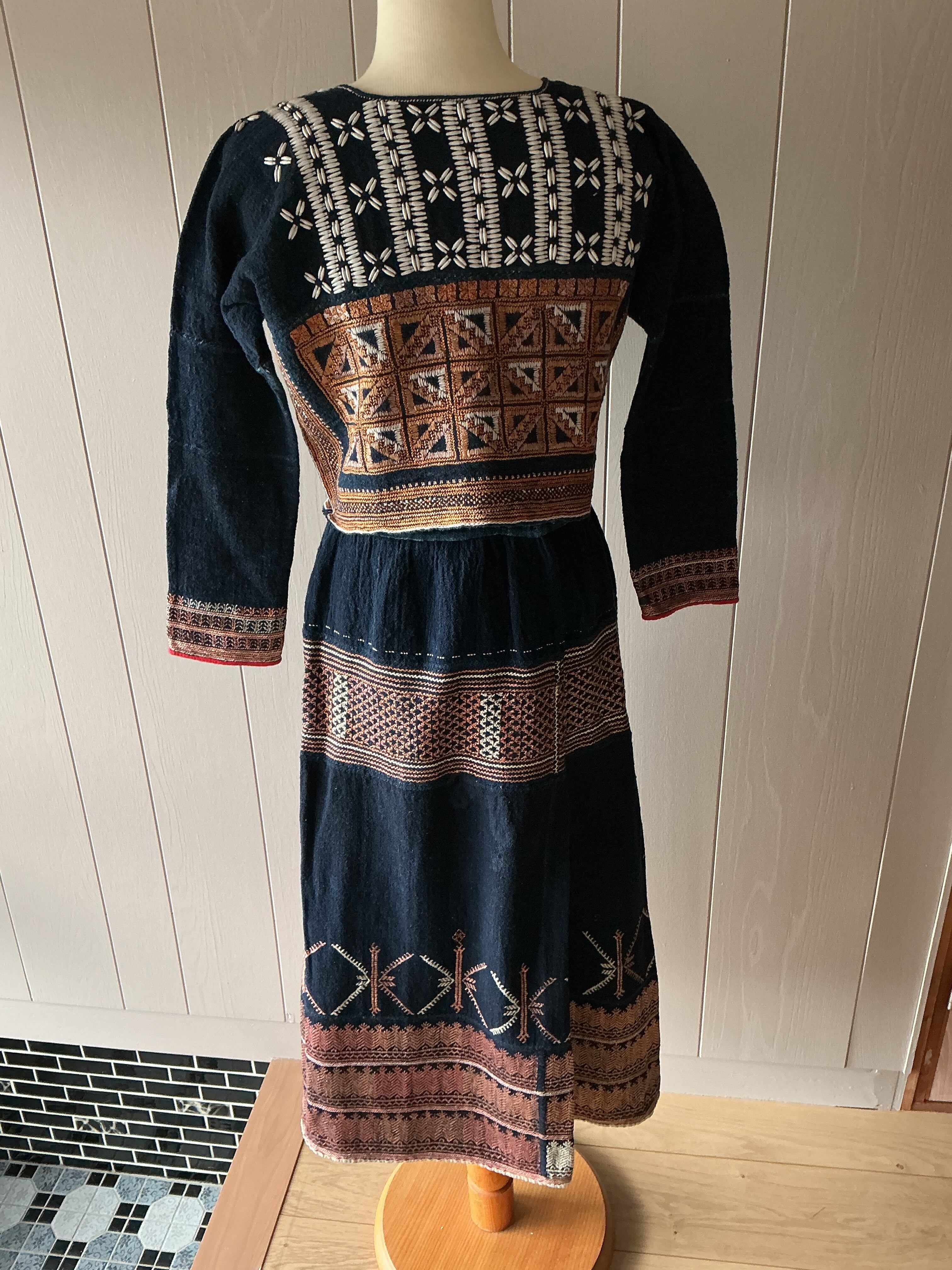 山岳民族の豊かな文化と伝統を体感できる、特別な民族衣装です。美しい色合いと独特の模様が魅力で、歴史と誇りを感じる一品です。山の民にとって 海への憧れが強く衣服の装飾に貝殻を使うのは富の象徴でした ざっくりした藍染め布にシックな色合いの精巧な手刺繍